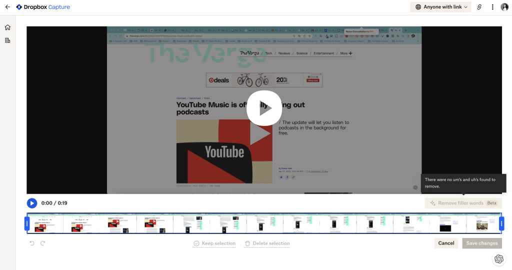 DropBox Capture video editing features are fairly basic. You can move the cursors at the beginning and the end of the video, choosing to either “keep” or “delete” the selection. This helps trim off the bits you don’t want usually at the start and the end of the videos. There’s also a “Remove filler words” feature currently in beta.