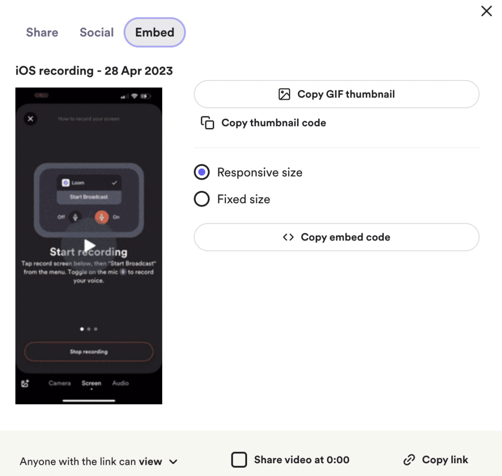 - You can also embed the LOom recording as “GIF thumbnail”, or embed it on a website using the embed code. While you are there, you can choose between a “Responsive size” or a “Fixed size” for the embed.