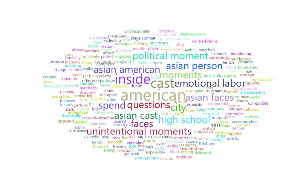 I know, that’s what it sounds like, and I think if you take it in isolation, it sounds a little bit odd maybe to isolate a group of people in this way. But if you look at it within the larger cultural context, it’s not only powerful, but it’s absolutely necessary to compensate for the comparative invisibility of Asian Americans. So the idea of seeing a whole room of them, and that this whole fictional world is populated by a diversity of Asian American and Asian people, is exactly what you want your theater to be about, which is about shaking your world. And that’s what great art should do. And I think this piece really inspires to that. It takes these Western pieces and so-called “Classics”, and gives them life in ways that we eat it, reconfigures them in ways that are new and astonishing to us.